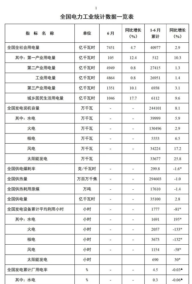 7月19日,國家能源局發(fā)布1-6月份全國電力工業(yè)統(tǒng)計數(shù)據(jù)。截至6月底,全國發(fā)電裝機容量約24.4億千瓦,同比增長8.1%。其中,風電裝機容量約3.4億千瓦,同比增長17.2%;太陽能發(fā)電裝機容量約3.4億千瓦,同比增長25.8%。 1-6月份,全國發(fā)電設(shè)備累計平均利用1777小時,比上年同期減少81...