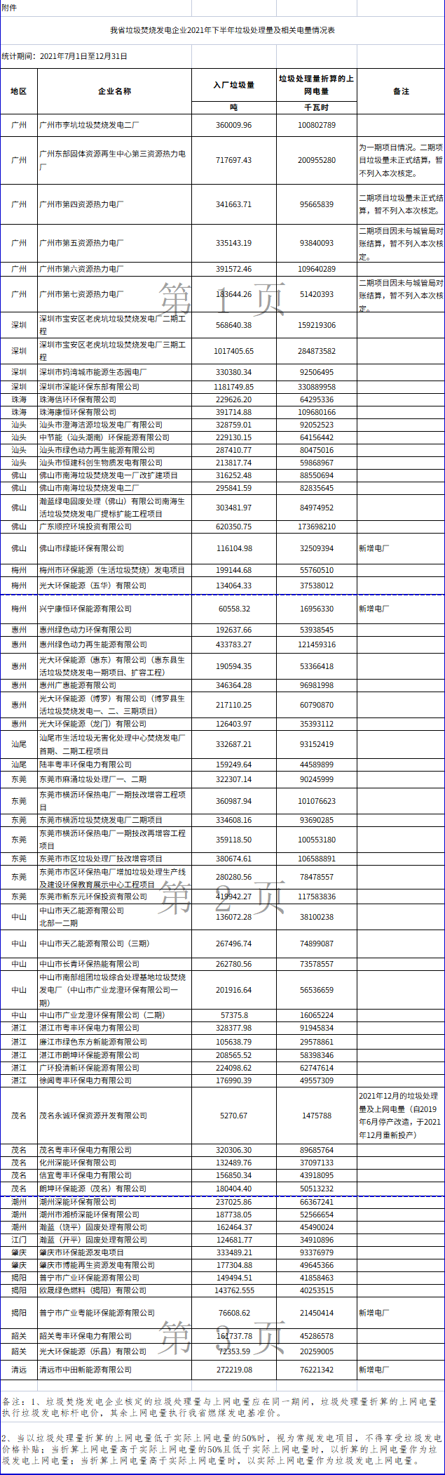廣東省發(fā)展改革委關(guān)于公布有關(guān)垃圾焚燒發(fā)電企業(yè)2021年下半年垃圾處理量及相關(guān)電量的通知