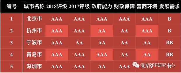 本指數(shù)可以給出PPP發(fā)展環(huán)境的展望和變化評(píng)價(jià),例如,可以報(bào)告兩年均為AAA的城市為北京、杭州、?島、深圳,2018年AAA的城市為寧波,2017年AAA的城市為武漢等等。