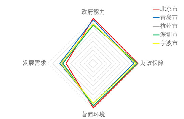 事實(shí)上,很多城市在PPP發(fā)展環(huán)境各個(gè)維度上的表現(xiàn)并不均衡。本指數(shù)也為診斷和分析各個(gè)城市的PPP發(fā)展環(huán)境提供了工具,為優(yōu)化和完善各地PPP發(fā)展環(huán)境提供了指引。下圖展示了北京、青島、杭州、深圳、寧波、重慶、烏魯木齊、武漢、鄭州在四個(gè)維度上的表現(xiàn),雷達(dá)圖可以提示城市在改善PPP發(fā)展環(huán)境時(shí)的重點(diǎn)和方向。