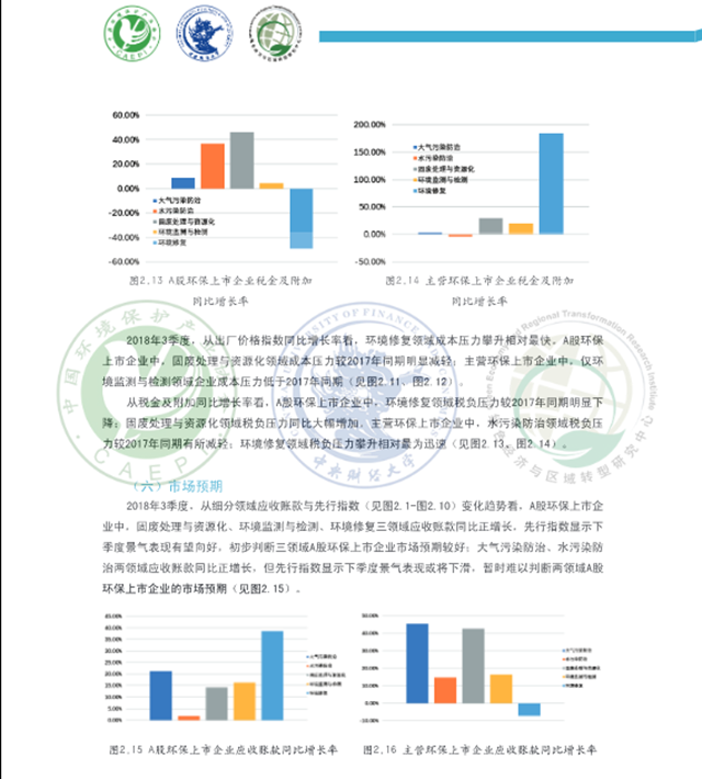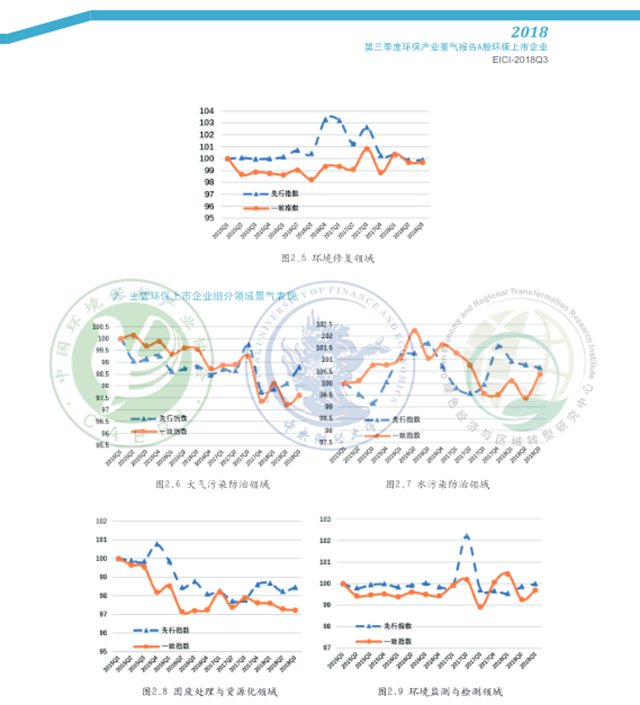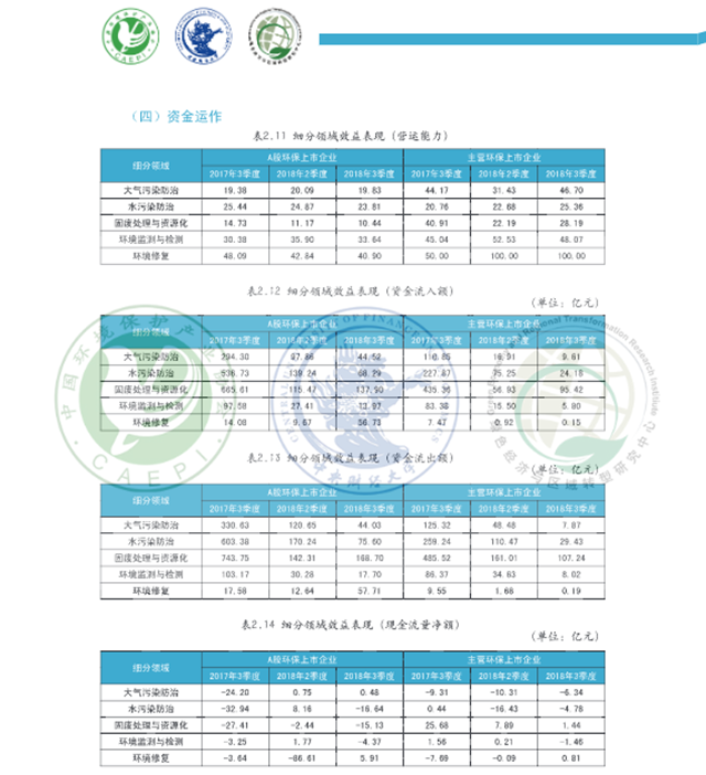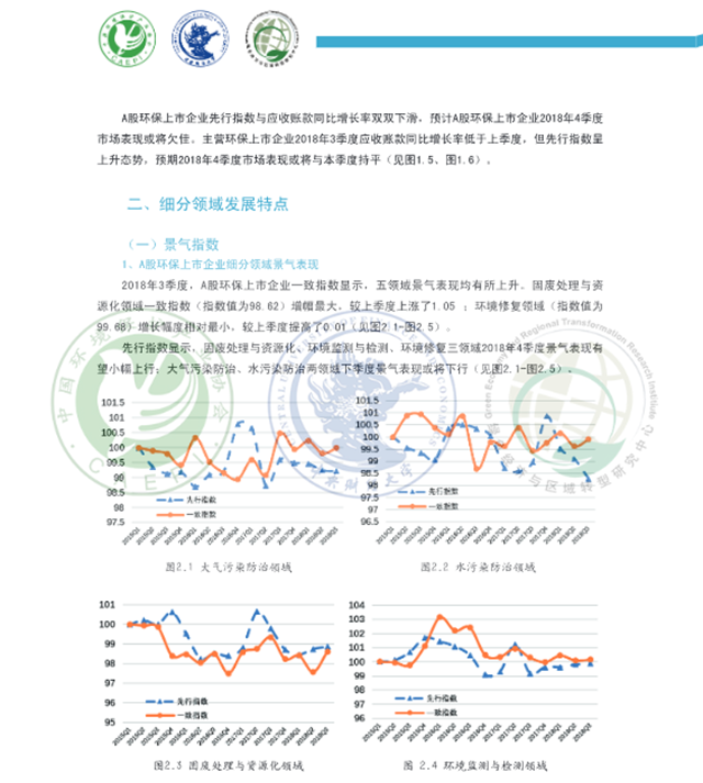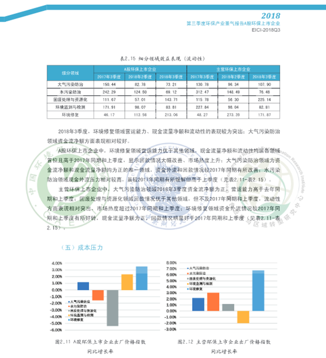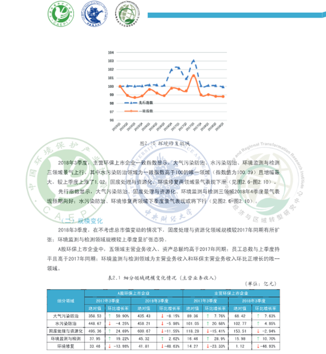 從細(xì)分領(lǐng)域看,A股環(huán)保上市企業(yè)2018年3季度各領(lǐng)域景氣表現(xiàn)呈現(xiàn)不同程度的回暖,主營環(huán)保上市企業(yè)在大氣污染防治、水污染防治、環(huán)境監(jiān)測和檢測三領(lǐng)域景氣表現(xiàn)回升。固廢處理與資源化領(lǐng)域規(guī)模較2017年同期有所擴(kuò)大, A股環(huán)保上市企業(yè)稅負(fù)壓力同比大幅增加,成本壓力較去年同期明顯減輕,預(yù)計(jì)該領(lǐng)域下季度景氣有望上行:大氣污染防治領(lǐng)域資金外流和國款情況較2017年同期有所改善,預(yù)計(jì)該領(lǐng)域A股環(huán)保上市企業(yè)下季度景氣表現(xiàn)下滑,主營環(huán)保上市企業(yè)下季度景氣有望上行:環(huán)境監(jiān)測與檢測領(lǐng)域規(guī)模較上季度呈擴(kuò)張態(tài)勢(shì), 效益表現(xiàn)總體優(yōu)于上季度,下季度該領(lǐng)域景氣表現(xiàn)有望上行:環(huán)境修復(fù)領(lǐng)域營運(yùn)能力、現(xiàn)金流量凈額和流動(dòng)性表現(xiàn)相對(duì)較好,A股環(huán)保上市企業(yè)稅負(fù)壓力較去年同期大幅下降,主營環(huán)保上市企業(yè)稅負(fù)壓力快速攀升,預(yù)計(jì)下季度A股環(huán)保上市企業(yè)景氣表現(xiàn)小幅上行,主營環(huán)保上市企業(yè)景氣或?qū)⑾禄核廴痉乐晤I(lǐng)域利潤總額、流動(dòng)性不及去年同期和上季度,A股環(huán)保上市企業(yè)成本壓力較去年同期有所減輕,主營環(huán)保上市企業(yè)稅負(fù)壓力同比小幅減輕,預(yù)計(jì)該領(lǐng)域下季度景氣表現(xiàn)下行。