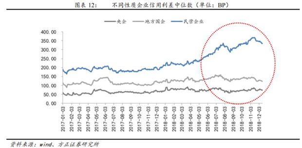 2018年民企融資信用利差持續(xù)擴(kuò)大。根據(jù)不同企業(yè)性質(zhì)的產(chǎn)業(yè)債信用利差統(tǒng)計,2018年4月以來,民企信用利差持續(xù)擴(kuò)大,到11月中旬達(dá)到接近370BP,近期開始回落,目前利差水平約在350個BP。