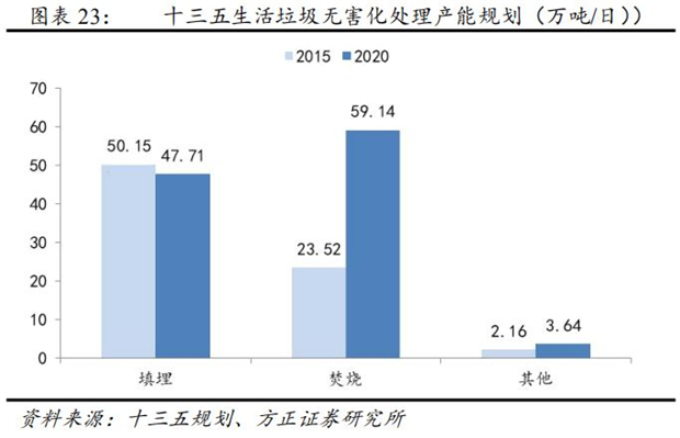 十三五規(guī)劃提出,到2020年全國垃圾焚燒處理能力要達(dá)到59.14萬噸/日,占無害化處理能力的比例達(dá)到54%,較2016年底27.82萬噸/日增加31.32萬噸/日。