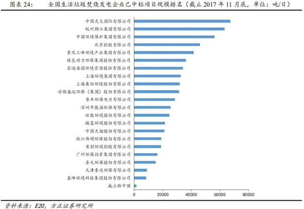 根據(jù)E20研究院統(tǒng)計排名,截止2017年11月底,已中標(biāo)的垃圾焚燒發(fā)電項目規(guī)模前五企業(yè)項目規(guī)模占比達(dá)到 42.26%,規(guī)模前十企業(yè)項目規(guī)模占比達(dá)到67.86%,行業(yè)市場集中度較高。