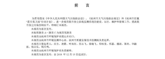 為貫徹落實國務(wù)院《打贏藍(lán)天保衛(wèi)戰(zhàn)三年行動計劃》和《杭州市“清潔排放區(qū)”建設(shè)暨大氣污染防治2018年實施計劃》加強(qiáng)揚(yáng)塵監(jiān)管,安裝在線監(jiān)測和視頻監(jiān)控設(shè)備的工作要求,規(guī)范我市揚(yáng)塵在線監(jiān)測系統(tǒng)的建設(shè)、維護(hù)和管理工作,進(jìn)一步提高我市揚(yáng)塵污染防治水平。杭州市環(huán)境監(jiān)測中心站和杭州市質(zhì)量技術(shù)監(jiān)督檢測院經(jīng)過廣泛調(diào)研,結(jié)合我市實際,編制完成了《杭州市揚(yáng)塵在線監(jiān)測系統(tǒng)技術(shù)規(guī)范(試行)》,并在征求相關(guān)部門意見的基礎(chǔ)上,已進(jìn)行修改完善,現(xiàn)予以發(fā)布。