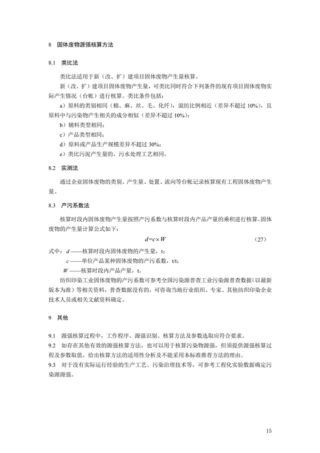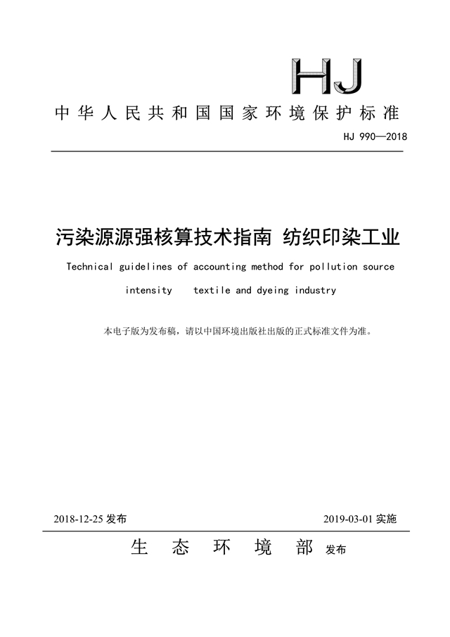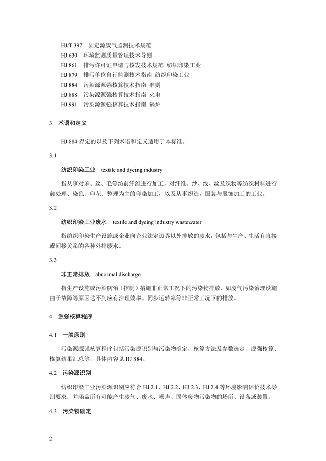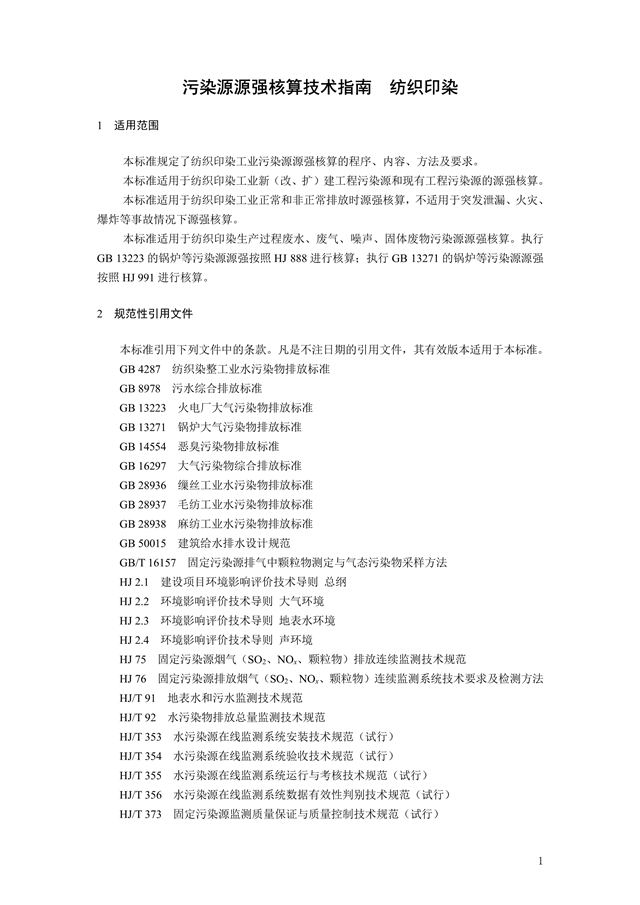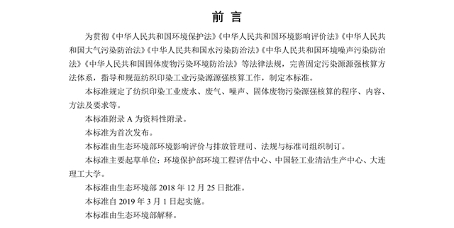 為貫徹《中華人民共和國環(huán)境保護法》《中華人民共和國環(huán)境影響評價法》《中華人民共和國大氣污染防治法》《中華人民共和國水污染防治法》《中華人民共和國環(huán)境噪聲污染防治法》《中華人民共和國固體廢物污染環(huán)境防治法》等法律法規(guī),完善固定污染源源強核算方法體系,指導和規(guī)范紡織印染工業(yè)污染源源強核算工作,制定本標準。本標準規(guī)定了紡織印染工業(yè)廢水、廢氣、噪聲、固體廢物污染源強核算的程序、內(nèi)容、方法及要求等。本標準附錄 A 為資料性附錄。本標準為首次發(fā)布。