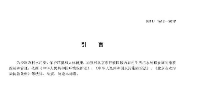 為落實《中共中央 國務(wù)院關(guān)于實施鄉(xiāng)村振興戰(zhàn)略的意見》和《農(nóng)村人居環(huán)境整治三年行動方案》,改善農(nóng)村人居環(huán)境,建設(shè)美麗宜居鄉(xiāng)村,穩(wěn)步推進農(nóng)村生活污水治理,2019年1月7日,北京市制訂并發(fā)布《農(nóng)村生活污水處理設(shè)施水污染物排放標準》(DB11/ 1612-2019)(以下簡稱“標準”)。