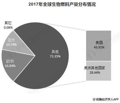 從2017年全球各區(qū)域生物燃料產(chǎn)量分布來看,主要集中在以美國為主的美洲國家,2017年達(dá)到了6085.9萬噸當(dāng)油量,全球占比達(dá)72.35%。其中美國2017年生物燃料產(chǎn)量為3693.6萬噸當(dāng)油量,占全球的43.91%,占美洲的60.69%;2017年歐洲國家生物燃料產(chǎn)量1416.7萬噸當(dāng)油量,占全球的16.84%。此外亞太地區(qū)為903.1萬噸當(dāng)油量,占比10.74%。