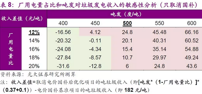 在此情景下,當優(yōu)化項目的噸發(fā)達到500度/噸,或是廠用電量占比低于12%時,便基本可以保證優(yōu)化項目的垃圾焚燒發(fā)電收入可以覆蓋基準項目電價補貼帶來的額外收入,優(yōu)化項目在無國補情況下仍然可以給公司帶來穩(wěn)定收益。