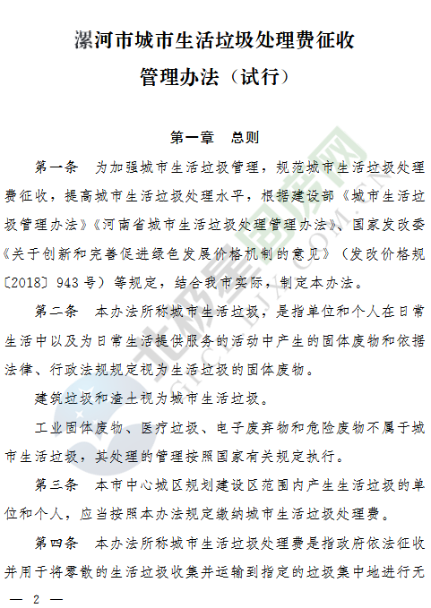 日前,《漯河市城市生活垃圾處理費(fèi)征收管理辦法(試行)》已經(jīng)河南漯河市政府第36次常務(wù)會(huì)議研究通過,并于2019年1月1日起試行。《漯河市城市生活垃圾處理費(fèi)征收管理辦法(試行)》是對(duì)《漯河市城市生活垃圾處理費(fèi)計(jì)收管理暫行辦法》(漯政〔2005〕73號(hào))的完善修訂。