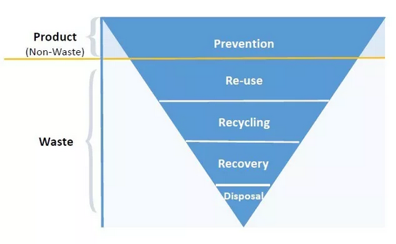在固廢處理領(lǐng)域,最重要的法規(guī)是1975年頒布的廢棄物框架指令,該指令頒布以來,經(jīng)歷了1991年、2006年、2008年共3次修訂,明確了關(guān)于廢棄物處理的各種概念、定義,是歐盟在固廢處理領(lǐng)域最重要的法律之一。該指令提出了固廢處理金字塔(European Waste Hierarchy)的概念。固廢處理金字塔是歐盟提出的應對廢棄物問題的處理原則,規(guī)定了各種方法的優(yōu)先級,體現(xiàn)了歐盟對于固廢處理的先進理念,歐盟各國也基本是在遵循此原則開展廢棄物處理工作。具體如下圖所示: