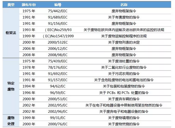 歐盟通過廢棄物框架指令確立了固廢處理的理念,建立了固廢處理體系,其相關(guān)的環(huán)境法律政策實際由兩部分組成,一部分是各類指令,從法律上直接對各成員國起約束作用,另一部分是定期頒布的環(huán)境行動規(guī)劃,對各成員國進行目標、內(nèi)容上的指導。