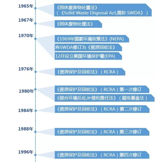 從70年代起,美國以《國家環(huán)境政策法》為基礎(chǔ),成立了國家環(huán)境保護署,制定了《固體廢物處理法》、《資源保護與回收利用法》、《危險廢物管理條例》、《綜合環(huán)境反應,補償和責任法》等諸多法律,經(jīng)過多年的發(fā)展,美國環(huán)衛(wèi)行業(yè)相關(guān)法律體系已經(jīng)非常完善。其發(fā)展脈絡(luò)如下圖所示: