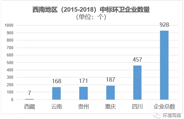 備注:西南地區(qū)(2015-2018)中標環(huán)衛(wèi)企業(yè)總數(shù)為928個,五省市區(qū)的中標企業(yè)數(shù)量之和大于928的原因在于:有少量規(guī)模較大的環(huán)衛(wèi)企業(yè)是跨省份投標,出現(xiàn)重復統(tǒng)計。