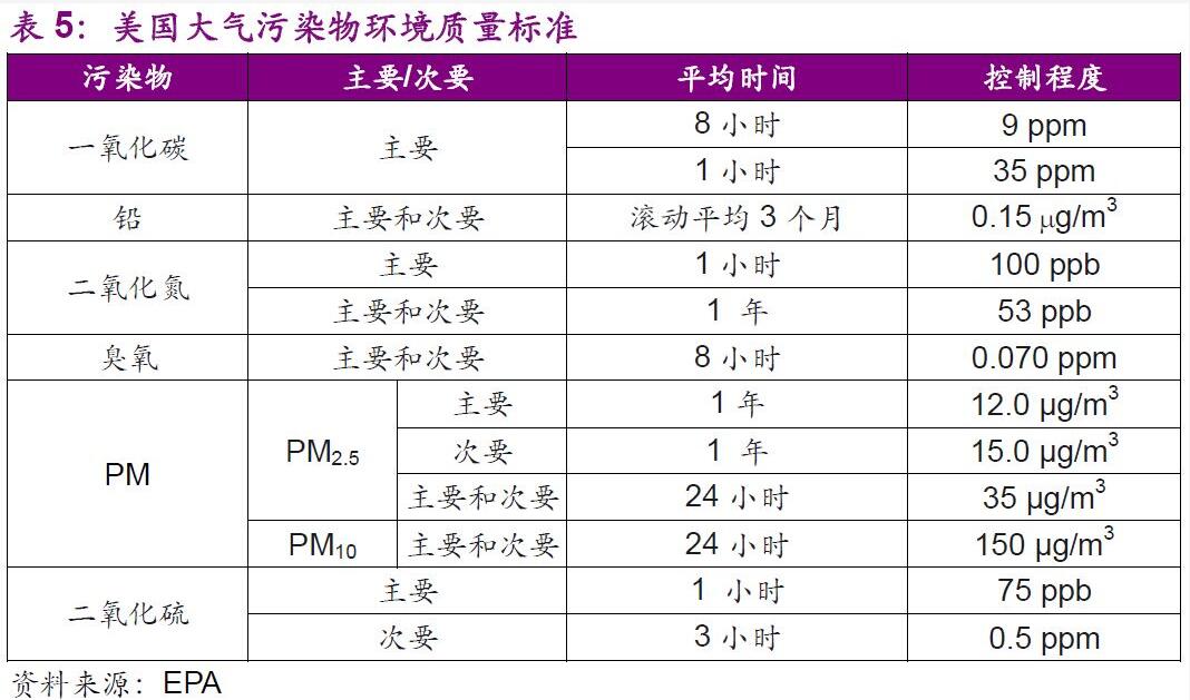 綜上所述,美國的大氣環(huán)保治理隨污染(洛杉磯煙霧、多諾拉事件)而起,通過一系列法律法規(guī)的修訂、全方面污染源的控制、以及特有的排污權(quán)交易體系的建立,較為成功的實現(xiàn)了空氣環(huán)境的治理和顯著改善。在政策和監(jiān)管的雙重壓力下,美國的排污企業(yè)(電廠、鋼企等)多通過自行研發(fā)并安裝脫硫脫硝設施和優(yōu)化生產(chǎn)技術(shù)的方式實現(xiàn)清潔排放,故美國并沒有大型的專精于脫硫脫硝技術(shù)的大氣環(huán)保類公司。目前,大氣治理行業(yè)在美國的關(guān)注度和市場均處于低位,這與美國目前的工業(yè)企業(yè)產(chǎn)能總量、布局、以及技術(shù)的先進程度有著很大關(guān)系,美國大氣治理行業(yè)目前的側(cè)重點在室內(nèi)空氣污染技術(shù)優(yōu)化和設備創(chuàng)新上,相關(guān)公司也多為小型的專注于室內(nèi)空氣污染解決方案和設備銷售的公司。