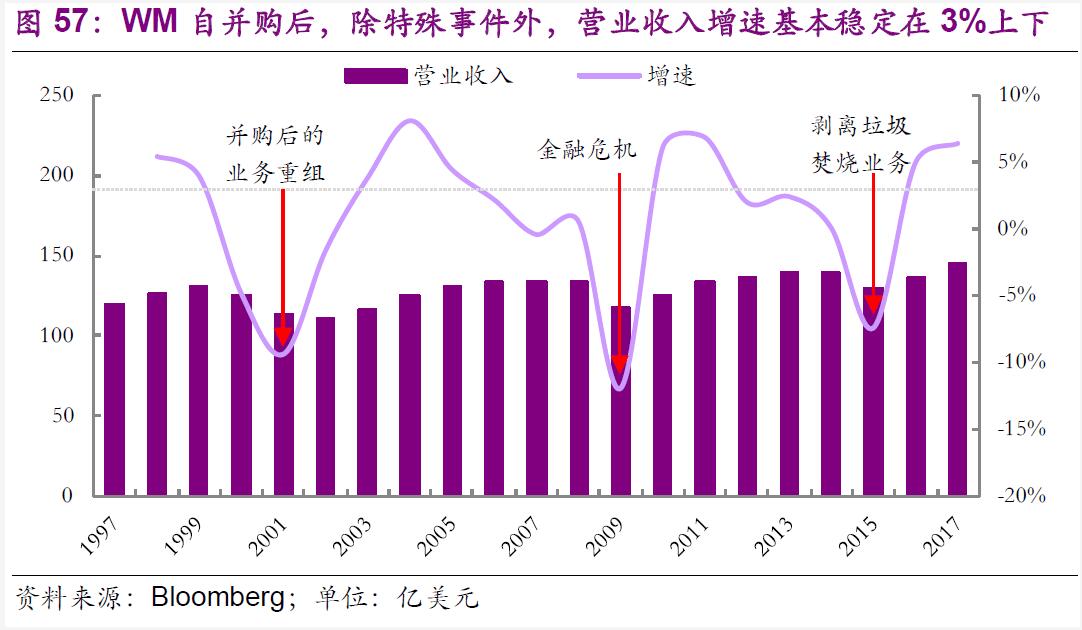 外因內(nèi)策聯(lián)動,助力公司發(fā)展。外因方面,美國居民消費支出增長帶動固廢產(chǎn)生量從1960年的560萬噸提升到1990年的2.08億噸;1970年前后,《固體廢物處置法》等法規(guī)的出臺催化行業(yè)向規(guī)范化標準化成長;固廢處置的成熟技術(shù)發(fā)展為固廢綜合管理提供有力支撐,而環(huán)保意識的逐漸完善則成為行業(yè)資源化、精細化處理轉(zhuǎn)型的決定性因素,帶動美國垃圾填埋處理占比從1960年的90%以上下降至2010年的54%,回收利用處理占比則從1960年的6%提升到2010年的34%。內(nèi)策方面,在對的時機采取對的兼并收購策略,先是幫助WM在行業(yè)高速發(fā)展階段通過140余次收購搶占市場份額,成為行業(yè)龍頭;在改變公司歷史的1998年的WM/UW合并后,又通過數(shù)十次大體量的核心業(yè)務收購進一步穩(wěn)固公司市場份額,以及數(shù)十次專業(yè)化新業(yè)務的收購完成新興業(yè)務開拓轉(zhuǎn)型,帶動公司實現(xiàn)新一輪騰飛。
