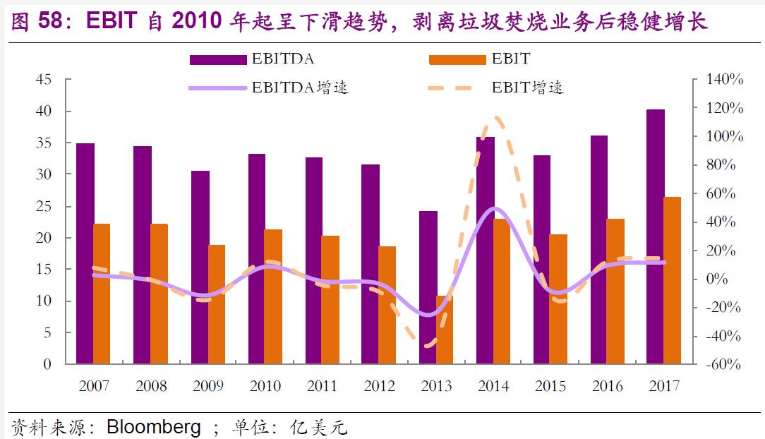 公司2017年垃圾處理量高達1.13億噸,實現(xiàn)營業(yè)收入145億美元,EBIT和EBITDA分別為26和40億美元。公司2017年固廢營業(yè)收入居全球第一,領(lǐng)先第二名威立雅達70%,而這一切都建立在公司僅在美國和加拿大運營的基礎上,充分展現(xiàn)出公司在固廢領(lǐng)域的絕對統(tǒng)治力。