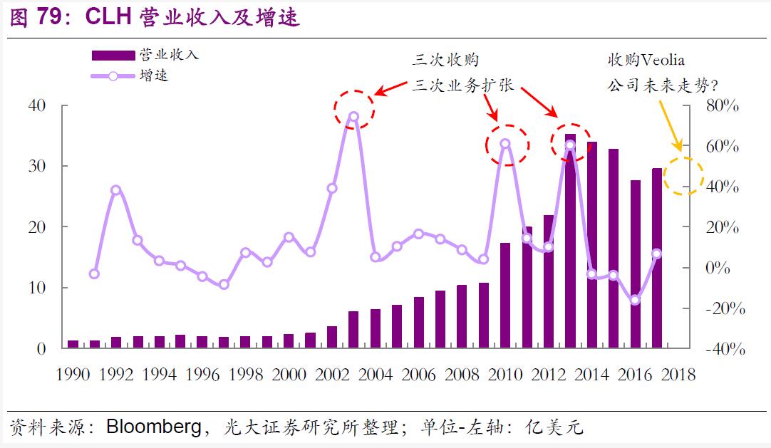 公司在成立后的近40年里,通過大大小小近40余次外延并購,在增加危險廢物處理設施的數(shù)量和覆蓋區(qū)域、擴大業(yè)務服務范圍的同時,也致力于增添新的涵蓋多個行業(yè)和業(yè)務類型的服務領(lǐng)域、擴大服務種類,最終從一家小型油罐清潔公司成長為北美領(lǐng)先的環(huán)境和工業(yè)服務提供商和最大的危險廢物處理公司。