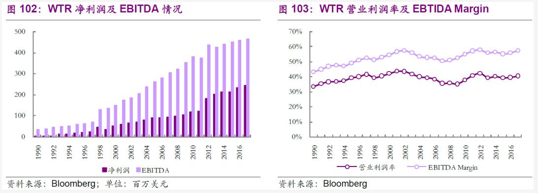 我們對WTR股價進行了復盤,為了較為明顯的展示收益特點,我們將其分為3個階段,第一階段,公司開始大規(guī)模的并購且進入收入和凈利潤快速增長期,此階段,公司較好的跑贏指數(shù);第二階段2000-2009年,公司營業(yè)收入和凈利潤增長為2.48和1.95倍,這個階段是公司成長最快的階段,股價最高峰漲幅接近3.5倍,雖然后受金融危機影響,但該過程實現(xiàn)了較多的超額收益;第三階段,由于前期股價漲幅較快公司估值并不具備優(yōu)勢,雖也體現(xiàn)了水務公司的公用事業(yè)屬性,漲幅雖然較好但未跑贏指數(shù)。