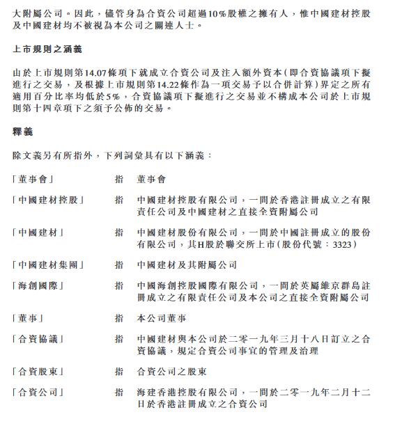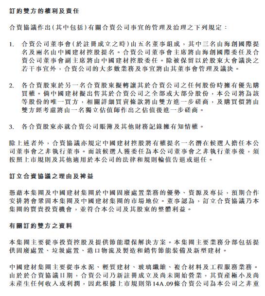 根據(jù)合資協(xié)議,合資協(xié)議訂約雙方合作目標(biāo)及范圍為由合資公司于中國(guó)成立一間有限責(zé)任公司(即外商獨(dú)資企業(yè)),主要目的為于中國(guó)從事固廢處置業(yè)務(wù)。外商獨(dú)資企業(yè)將全權(quán)負(fù)責(zé)投資(不論以控股、參股或其他投資方式)、經(jīng)營(yíng)及管理中國(guó)建材從事水泥相關(guān)業(yè)務(wù)的若干附屬公司(關(guān)聯(lián)水泥企業(yè))現(xiàn)有及未來(lái)的固廢處置業(yè)務(wù),預(yù)計(jì)規(guī)劃處置總產(chǎn)能不少于300萬(wàn)噸/年。
