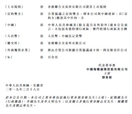 海螺創(chuàng)業(yè)公告,于2019年2月12日,一間合資公司于香港注冊(cè)成立,該公司乃由海創(chuàng)國(guó)際(公司全資附屬公司)與中國(guó)建材控股(中國(guó)建材全資附屬公司)共同設(shè)立。于2019年3月18日,公司與中國(guó)建材訂立合資協(xié)議,內(nèi)容有關(guān)合資公司事宜的管理及治理以及公司與中國(guó)建材之間的合作范圍。