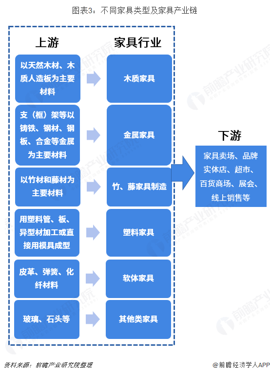 根據(jù)《國(guó)民經(jīng)濟(jì)產(chǎn)業(yè)分類》中,家具制造業(yè)是指用木材、金屬、塑料、竹、藤等材料制作的,具有坐臥、憑倚、儲(chǔ)藏、間隔等功能,可用于住宅、旅館、辦公室、學(xué)校、餐館、醫(yī)院、劇場(chǎng)、公園、船艦、飛機(jī)、機(jī)動(dòng)車等任何場(chǎng)所的各種家具的制造。按照家具其主要使用材料進(jìn)行分類,包括木質(zhì)家具、金屬家具、竹藤家具、塑料家具及其他家具類型,其對(duì)應(yīng)的下游包括家具賣場(chǎng)、品牌實(shí)體店、超市、百貨商場(chǎng)、展會(huì)及線上銷售等。