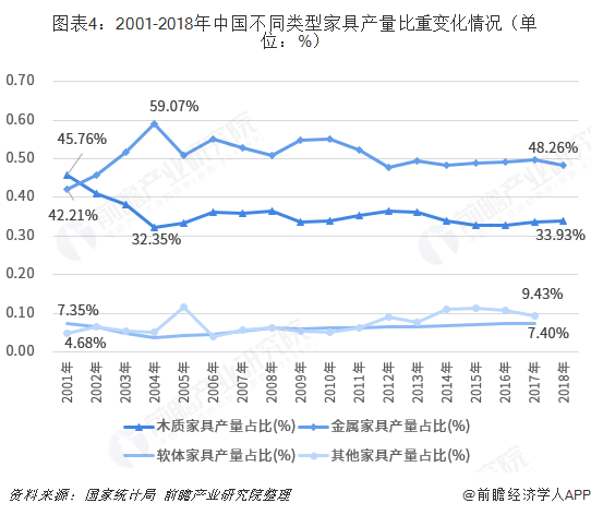 從2001-2018年中國(guó)不同類型家具產(chǎn)量占比變化情況看,中國(guó)生產(chǎn)的家具以木質(zhì)家具和金屬家具為主,軟體家具、竹藤類家具、塑料家具等所占比重較小;2001年以后,金屬家具產(chǎn)量比重就超過(guò)了木質(zhì)家具,金屬家具產(chǎn)量比重基本保持在50%上下,木質(zhì)家具產(chǎn)量比重保持在35%上下。