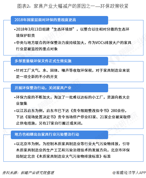 2018年家具產(chǎn)量大幅減產(chǎn)的原因之一是環(huán)保政策的陸續(xù)出臺(tái)。環(huán)保政策的收緊,國(guó)家及地區(qū)對(duì)木質(zhì)家具企業(yè)的污染問(wèn)題、甲醛問(wèn)題等陸續(xù)進(jìn)入進(jìn)入整治階段,中小家具企業(yè)陸續(xù)倒閉,家具行業(yè)數(shù)量減少,導(dǎo)致全國(guó)總產(chǎn)量減少。2018年國(guó)家層面對(duì)環(huán)保的重視度更高:2018年3月13日組建“生態(tài)環(huán)境部”,以整合以往相對(duì)分散的生態(tài)環(huán)境保護(hù)職責(zé);中央與地方聯(lián)合的環(huán)保整治力度持續(xù)加大,作為VOCs排放大戶的家具行業(yè)是被監(jiān)控的重點(diǎn)對(duì)象;多部重量級(jí)環(huán)保文件正式生效實(shí)施:針對(duì)大氣污染治理、水污染治理、固廢污染治理、噪聲污染治理等收取環(huán)保稅,對(duì)于家具制造業(yè)來(lái)說(shuō)是一項(xiàng)全新的不小的開支。環(huán)保力度的不斷加大,淘汰了一批難以達(dá)標(biāo)的小工廠,資源向著大企業(yè)聚集;以江蘇啟東為例,啟東市已下達(dá)《責(zé)令限期整改指令書》280余份,下達(dá)《現(xiàn)場(chǎng)處置決定書》責(zé)令當(dāng)場(chǎng)停產(chǎn)停業(yè)83家、21家企業(yè)被企業(yè)被采取停止供電措施,另有27家自行搬遷或關(guān)閉……