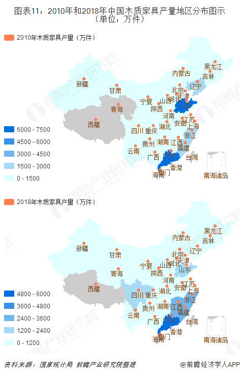第一,部分地區(qū)木質(zhì)家具從無(wú)到有、從有到無(wú);有中小木質(zhì)家具企業(yè)入駐青海,2018年產(chǎn)量達(dá)到1.02萬(wàn)輛;內(nèi)蒙古和海南的木質(zhì)家具產(chǎn)業(yè)陸續(xù)遷出,2018年產(chǎn)量為零。