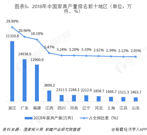從家具產(chǎn)量整體情況看,2018年中國(guó)家具產(chǎn)量排名前十的地區(qū)有浙江、廣東、福建、江西、四川、河南、遼寧、河北、上海、江蘇和山東,有7個(gè)是東部地區(qū)。其中浙江省產(chǎn)量高達(dá)2.13億件,占比29.90%,排名第一;廣東地區(qū)產(chǎn)量排名第二,占比20.96%;福建排名第三,占比18.18%。