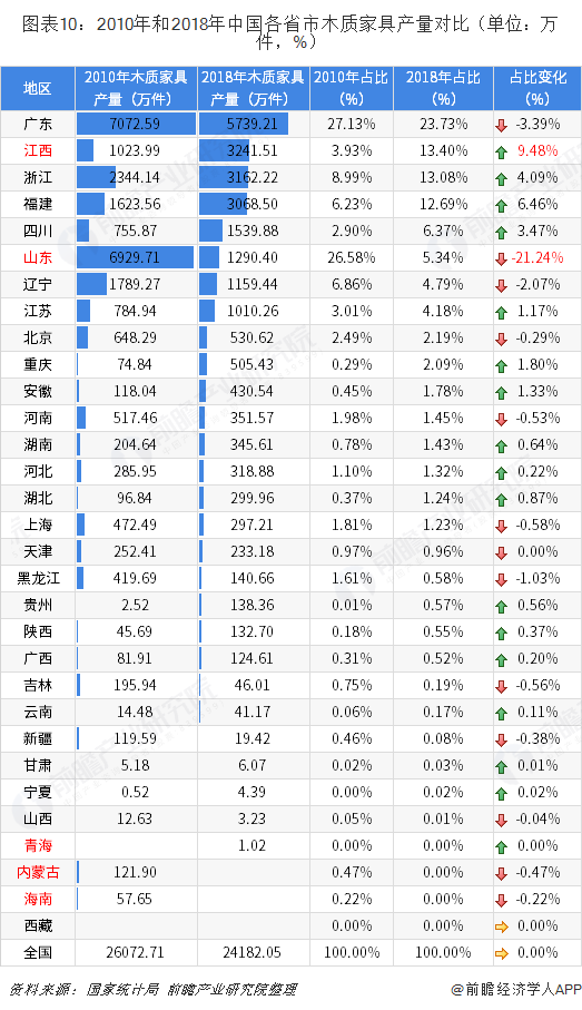 第二,與2010年相比,2018年全國(guó)木質(zhì)家具產(chǎn)量有所降低,但是大部分地區(qū)的產(chǎn)量有所增加,如江西、浙江、福建、四川等地區(qū);這主要是由于廣東和山東的木質(zhì)家具產(chǎn)量大幅下降,尤其是山東省;2010年山東和廣東的木質(zhì)家具產(chǎn)量份額均在27%上下,但是2018年山東省產(chǎn)量份額下降至5.34%。