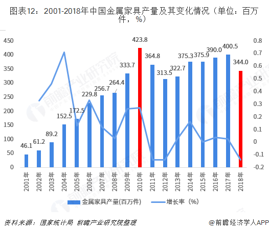 根據(jù)國(guó)家統(tǒng)計(jì)局統(tǒng)計(jì),金屬家具的發(fā)展階段與家具行業(yè)整體發(fā)展歷程十分相似;2001-2010年處于行業(yè)增長(zhǎng)期,2010年金屬家具產(chǎn)量達(dá)到423.8百萬(wàn)件,達(dá)到歷史最高;2011-2018年行業(yè)處于調(diào)整期,產(chǎn)量漲跌幅度較大。2018年中國(guó)家具總產(chǎn)量下降94.26百萬(wàn)件,僅金屬產(chǎn)量2018年就大幅減產(chǎn)56.51百萬(wàn)輛,貢獻(xiàn)率高達(dá)60%。