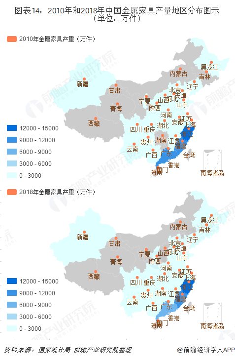 對(duì)比2010年和2018年各省市的金屬家具產(chǎn)量數(shù)據(jù)及分布圖示發(fā)現(xiàn)金屬家具產(chǎn)業(yè)遷移呈以下特點(diǎn)。