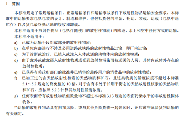 本標(biāo)準(zhǔn)規(guī)定了常規(guī)運(yùn)輸條件、正常運(yùn)輸條件和運(yùn)輸事故條件下放射性物品運(yùn)輸安全要求。本標(biāo)準(zhǔn)中的運(yùn)輸要求包括包裝的設(shè)計(jì)、制造和維護(hù),也包括貨包的準(zhǔn)備、托運(yùn)、裝載、運(yùn)載(包括中途貯存)以及貨包最終抵達(dá)地的接收和卸載。
