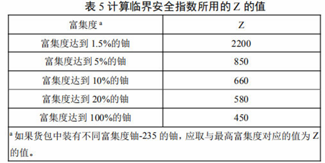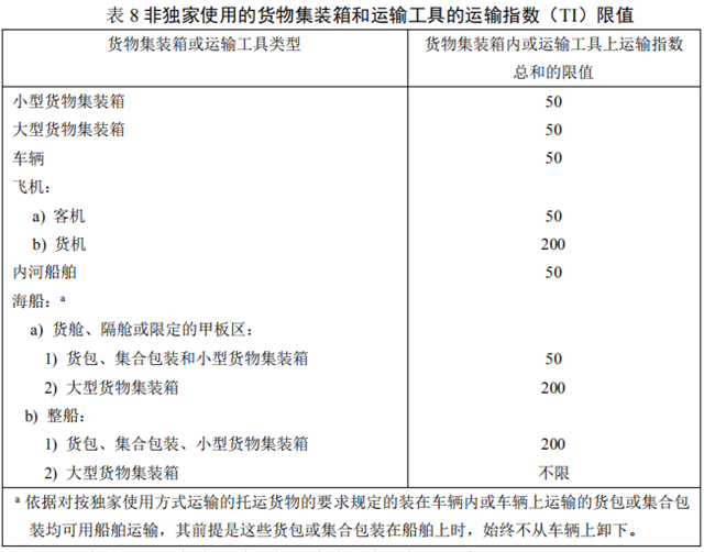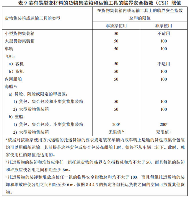 任何貨包或集合包裝的運(yùn)輸指數(shù)應(yīng)不超過10,任何貨包或集合包裝的臨界安全指數(shù)應(yīng)不超過50,按獨(dú)家使用方式運(yùn)輸?shù)耐羞\(yùn)貨物除外。