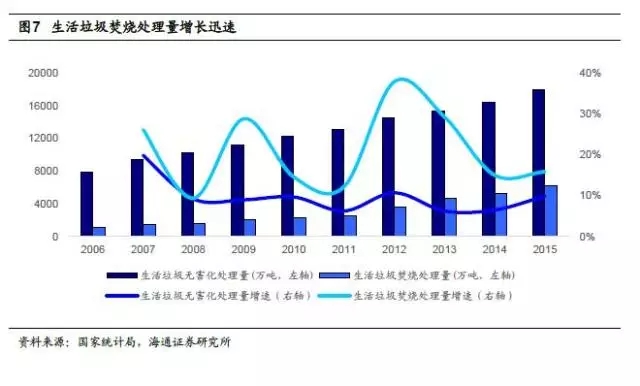 目前衛(wèi)生填埋處理占主導(dǎo)地位,長期看焚燒處理優(yōu)勢明顯、增速較快。常見的垃圾無害化處理方式有衛(wèi)生填埋、焚燒和高溫堆肥。其中,我國垃圾焚燒處理量占比從2006年的14.45%上升到2015年的34.28%,2015年焚燒處理量為6176萬噸,處理能力為21.9萬噸/日(約8000萬噸/年);衛(wèi)生填埋占比從2006年的81.4%下降到2015年的63.75%,2015年處理量為11483萬噸,處理能力為34.4萬噸/日(約12600萬噸/年),而近年高溫堆肥處理量極少,2015年僅為354萬噸。垃圾焚燒與填埋法相比,經(jīng)濟效益和環(huán)境保護程度更高:①減量縮容:在垃圾經(jīng)過焚燒后,一般可減重80%,減容90%以上,節(jié)約大量的土地資源;②資源再利用:按熱值比較,每噸生活垃圾約相當于0.2-0.25噸標準煤,垃圾焚燒發(fā)電的資源綜合利用效益相當可觀;③污染弱:垃圾焚燒主要產(chǎn)生的氣體為二氧化碳。因而垃圾焚燒成為近年來國家推崇的無害化處理方式,在垃圾無害化處理中的占比逐年上升。