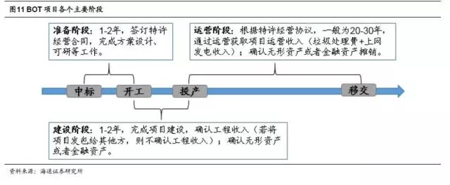 對項目公司而言,項目中標后,主要會經(jīng)歷三個階段,分別是準備階段(一般為1-2年,完成項目的前期準備工作,簽訂特許經(jīng)營合同,完成環(huán)評、可研報告等工作)、建設(shè)階段(一般為1-2年,完成項目建設(shè),確認工程收入,若項目外包給其他方,則不確認)和運營階段(在特許經(jīng)營期內(nèi),負責(zé)項目的運營,獲取垃圾處理費補貼和上網(wǎng)發(fā)電收入),特許經(jīng)營期到期之后,項目無償移交給政府。