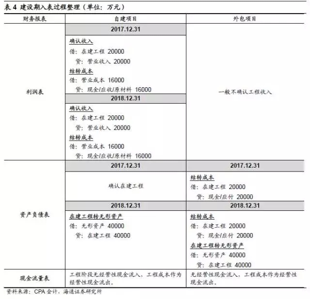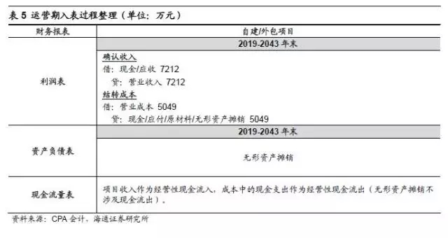 若該項目為項目公司自建,則建設(shè)期項目公司將根據(jù)完工進度確認工程收入并計入在建工程,項目完工后在建工程轉(zhuǎn)為無形資產(chǎn),工程階段雖有工程收入并確認利潤,但并無實際經(jīng)營性現(xiàn)金流入。若項目公司將項目發(fā)包,通常不確認工程收入,即建造期不影響利潤表,根據(jù)完工進度向承包方支付工程款,確認在建工程,項目完工后將在建工程結(jié)轉(zhuǎn)為無形資產(chǎn)。項目運營階段,公司確認項目運營收入(主要是垃圾處理費和上網(wǎng)發(fā)電收入),結(jié)轉(zhuǎn)相關(guān)成本,成本項包含無形資產(chǎn)的攤銷。項目建設(shè)期和運營期的主要會計科目錄入如表4和表5:
