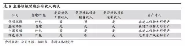 通常而言,對于垃圾焚燒BOT項目,如果公司自建,則會確認工程收入,如果將項目外包,則不確認工程收入。四家公司中,盛運環(huán)保項目主要為自建,并且確認工程收入,而偉明環(huán)保和中國天楹主要采取外包的方式,不確認工程收入。綠色動力有所不同,公司將項目發(fā)包給其他方,但考慮到其對項目負有整體履約責(zé)任并承擔所有費用和風(fēng)險,在項目建造階段確認相應(yīng)的建造收入,該等建造收入根據(jù)獨立評估師評定的公允價值計量。此外,盛運環(huán)保和中國天楹確認設(shè)備銷售收入,偉明環(huán)保與綠色動力則不確認,四家公司都確認項目運營收入。