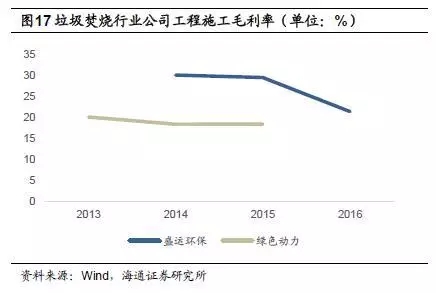 盛運環(huán)保和綠色動力兩家公司確認工程業(yè)務(wù)收入。工程業(yè)務(wù)毛利率方面,盛運環(huán)保相對較高,2015年為29.4%,2016年下降至21.3%;綠色動力雖確認工程業(yè)務(wù)收入,但項目主要系外包給其他方,建造收入根據(jù)獨立評估師評定的公允價值計量,毛利率較低,2015年為18.3%。