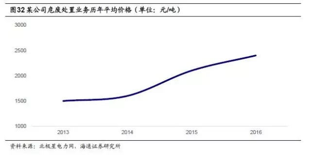 危廢處置價格穩(wěn)步上升,市場空間巨大。從核準經(jīng)營規(guī)???,危廢處置產(chǎn)能緊缺,2015年核準處置規(guī)模僅982.4萬噸/年。近年來,危廢處置價格呈現(xiàn)穩(wěn)步上升趨勢。以行業(yè)內(nèi)某領(lǐng)先企業(yè)為例,2013年,其危廢處置業(yè)務(wù)平均價格為1500元/噸左右,2016年則上升至2500元/噸左右。以全國環(huán)境統(tǒng)計公報數(shù)據(jù)為基礎(chǔ),假設(shè)未來幾年危廢產(chǎn)生量保持過去十年復(fù)合增長率12%的增速,保守估計處置率為35%,單位處置成本為2500元/噸,則預(yù)計2020年危廢處置市場為613億元,2017-2020處置市場空間總計2086億元。考慮到還有大量的危廢沒有進入國家統(tǒng)計口徑,若將這些量考慮在內(nèi),市場空間還將提升2-3倍。