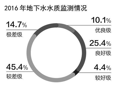 以地下水含水系統(tǒng)為單元,潛水為主的淺層地下水和承壓水為主的中深層地下水為對象的6124個地下水水質監(jiān)測點中,水質為優(yōu)良級、良好級、較好級、較差級和極差級的監(jiān)測點分別占10.1%、25.4%、4.4%、45.4%和14.7%。