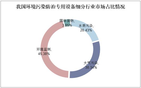 從我國(guó)我國(guó)環(huán)境污染防治專用設(shè)備細(xì)分行業(yè)市場(chǎng)占比情況來看,其中環(huán)境監(jiān)測(cè)占比最大,為45.38%,其次是大氣污染防治專用設(shè)備和水質(zhì)污染防治專用設(shè)備,分別占比30.34%、20.43%,