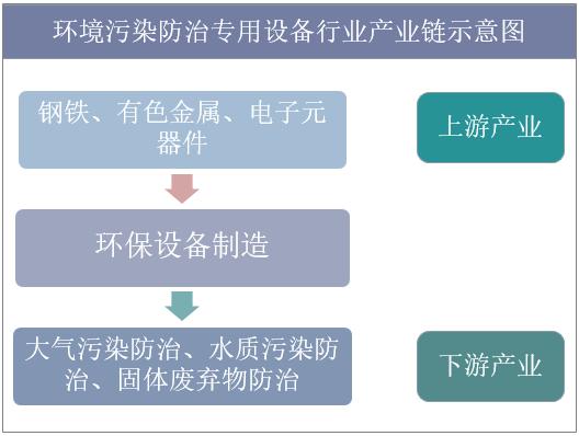 環(huán)境污染防治專用設(shè)備主要包括環(huán)保設(shè)備行業(yè)專用設(shè)備、廢舊物品加工機(jī)械,以及工業(yè)材料回收專用設(shè)備,其中環(huán)保設(shè)備行業(yè)專用設(shè)備主要包括大氣污染防治設(shè)備、固體廢棄物處理設(shè)備、噪聲與振動(dòng)控制設(shè)備等。其上游主要是鋼鐵、有色金屬、電子元器件等產(chǎn)業(yè),下游則主要包括大氣污染防治、水質(zhì)污染防治和固體廢棄物防治等環(huán)保產(chǎn)業(yè)。