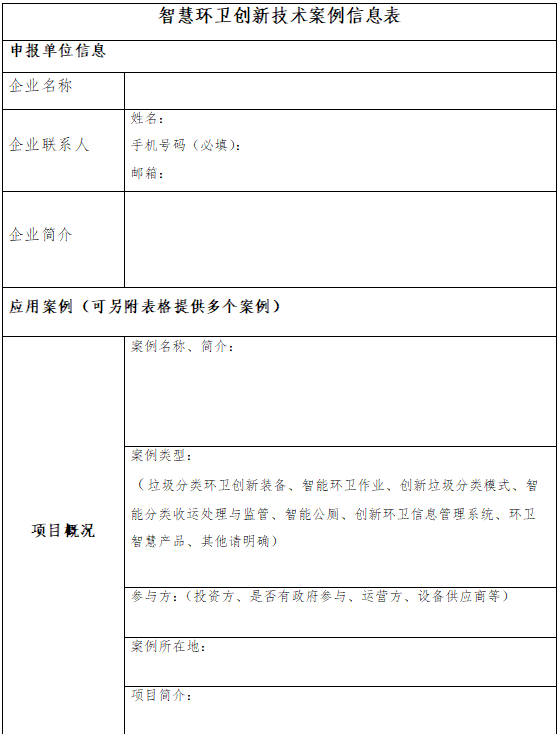 智慧環(huán)衛(wèi)是智慧城市的一個(gè)重要組成部分,智慧城市的建設(shè)迫切需要智慧環(huán)衛(wèi)的提升。在此背景下,中國(guó)環(huán)聯(lián)擬面向行業(yè)征集“智慧環(huán)衛(wèi)創(chuàng)新技術(shù)案例”,征集范圍包括垃圾分類(lèi)環(huán)衛(wèi)創(chuàng)新裝備、智能環(huán)衛(wèi)作業(yè)、創(chuàng)新垃圾分類(lèi)模式、智能分類(lèi)收運(yùn)處理與監(jiān)管、智能公廁、創(chuàng)新環(huán)衛(wèi)信息管理系統(tǒng)、環(huán)衛(wèi)智慧產(chǎn)品等的環(huán)衛(wèi)相關(guān)落地應(yīng)用項(xiàng)目案例。請(qǐng)有意向的企業(yè)按附件填寫(xiě)申報(bào)表,并發(fā)郵件至以下郵箱地址。