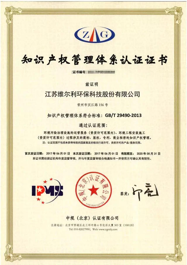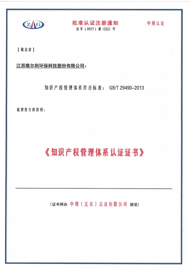 2017年6月,江蘇維爾利環(huán)保科技股份有限公司順利通過認證,獲得GB/T29490-2013知識產權管理體系認證證書。
