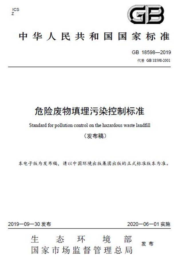 日前,生態(tài)環(huán)境部發(fā)布《危險廢物填埋污染控制標(biāo)準(zhǔn)(GB 18598-2019)》。全文如下:
