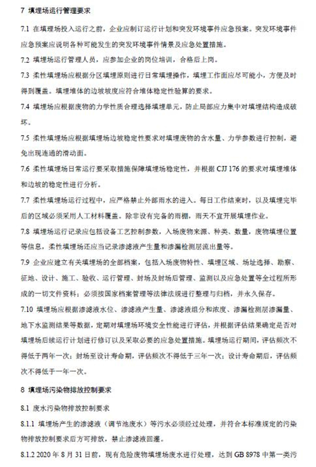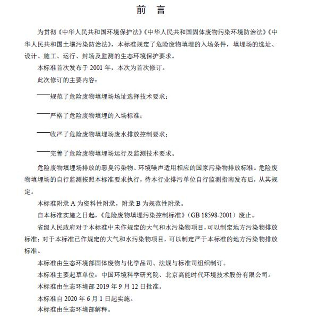 該標(biāo)準(zhǔn)自2020年6月1日起實施,自實施之日起,《危險廢物填埋污染控制標(biāo)準(zhǔn)》(GB18598-2001)同時廢止。