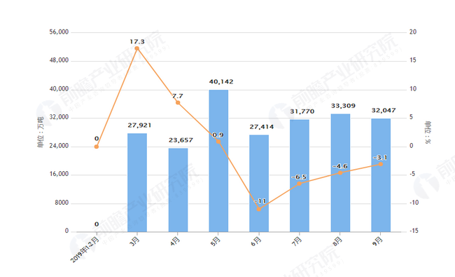 據(jù)國家統(tǒng)計局統(tǒng)計數(shù)據(jù)顯示,2019年8月中國大氣污染防護(hù)設(shè)備產(chǎn)量為33309萬噸,同比下降4.6%,2019年9月中國大氣污染防護(hù)設(shè)備產(chǎn)量為32047套,同比下降3.1%,2019年1-9月中國大氣污染防護(hù)產(chǎn)量為351097套,累計下降7%。