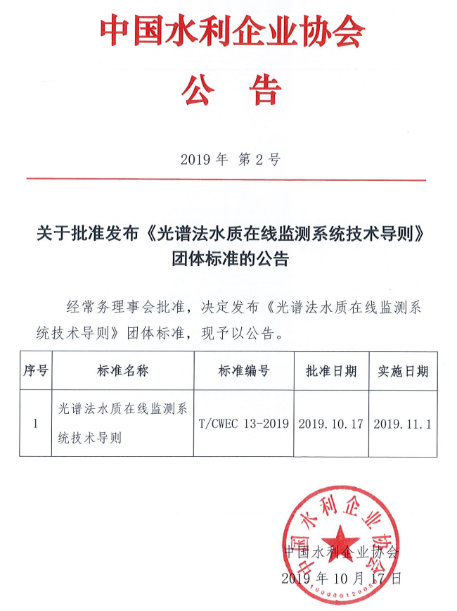 《光譜法水質(zhì)在線監(jiān)測系統(tǒng)技術(shù)導(dǎo)則》(T/CWEC 13-2019)團(tuán)體標(biāo)準(zhǔn)于2019年10月17日由中國水利企業(yè)協(xié)會發(fā)布,并于2019年11月1日實(shí)施。這是我國對光譜法水質(zhì)在線監(jiān)測技術(shù)裝備市場與行業(yè)應(yīng)用提出的第一個重要標(biāo)準(zhǔn),填補(bǔ)了我國此項(xiàng)技術(shù)市場應(yīng)用標(biāo)準(zhǔn)上的空白。